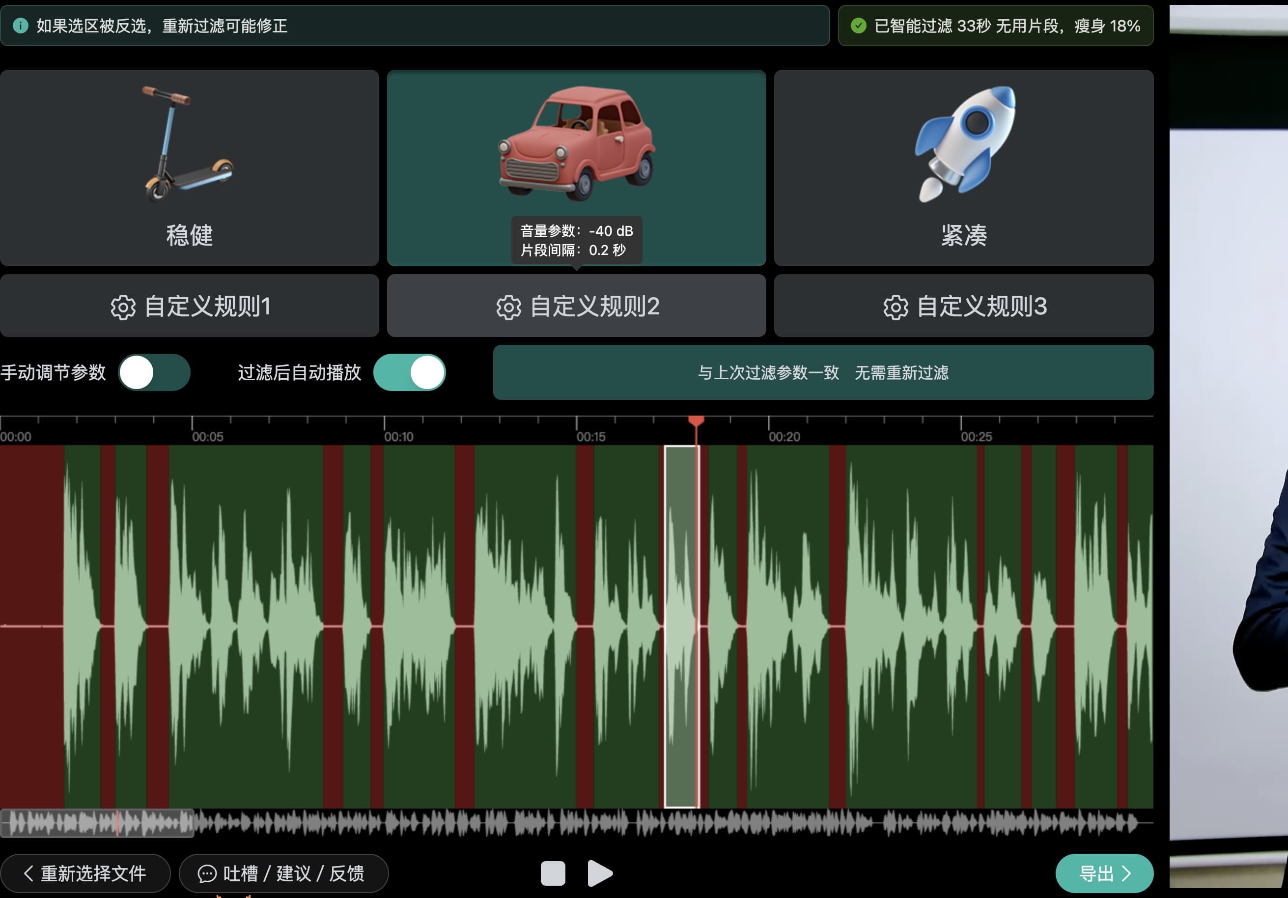 打开软件,点击,选择音频,可以看到顶部默认有三个设置,分别是 稳健,精炼,紧凑,现在使用的是紧凑进行剪辑,片段间隔 0 秒,智能过滤了 27 秒。,如果是选择稳健,片段间隔 0.5 秒,点击重新过滤,会发现没有剪辑的断点,说明音频中没有 0.5 秒以上的间隔,也就不会剪辑,选择精炼,片段间隔 0.23 秒,点重新过滤,智能过滤了 6 秒的间隔停顿。