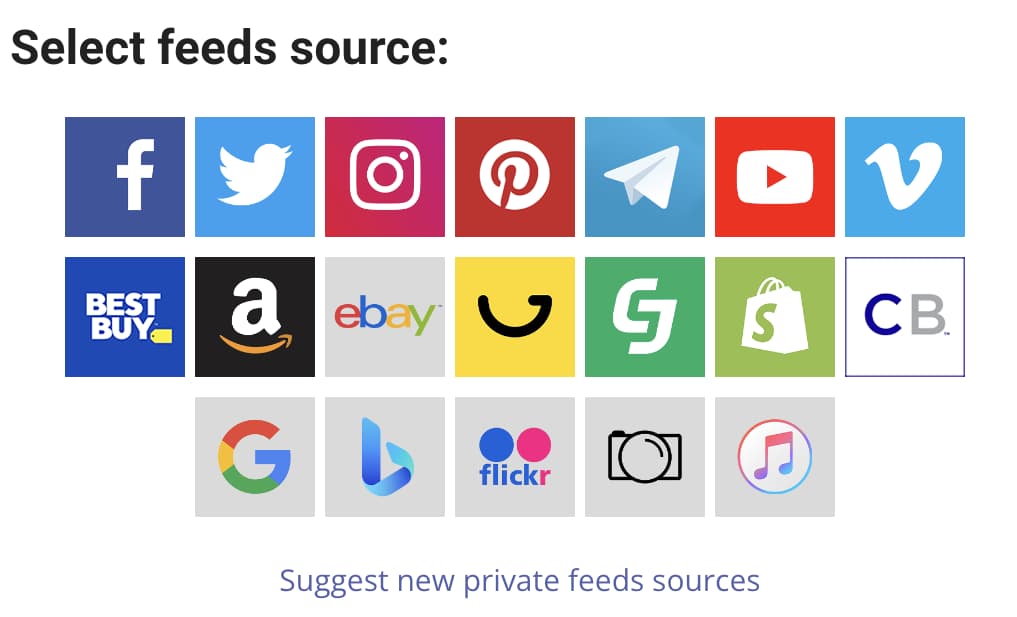 您可以使用关键字和一组过滤条件,从默认情况下没有 Feed 的来源生成 Feed。Facebook页面或Twitter推文,亚马逊或eBay产品,Google或Bing新闻,YouTube视频或Flickr图像等内容只需点击一下即可。
