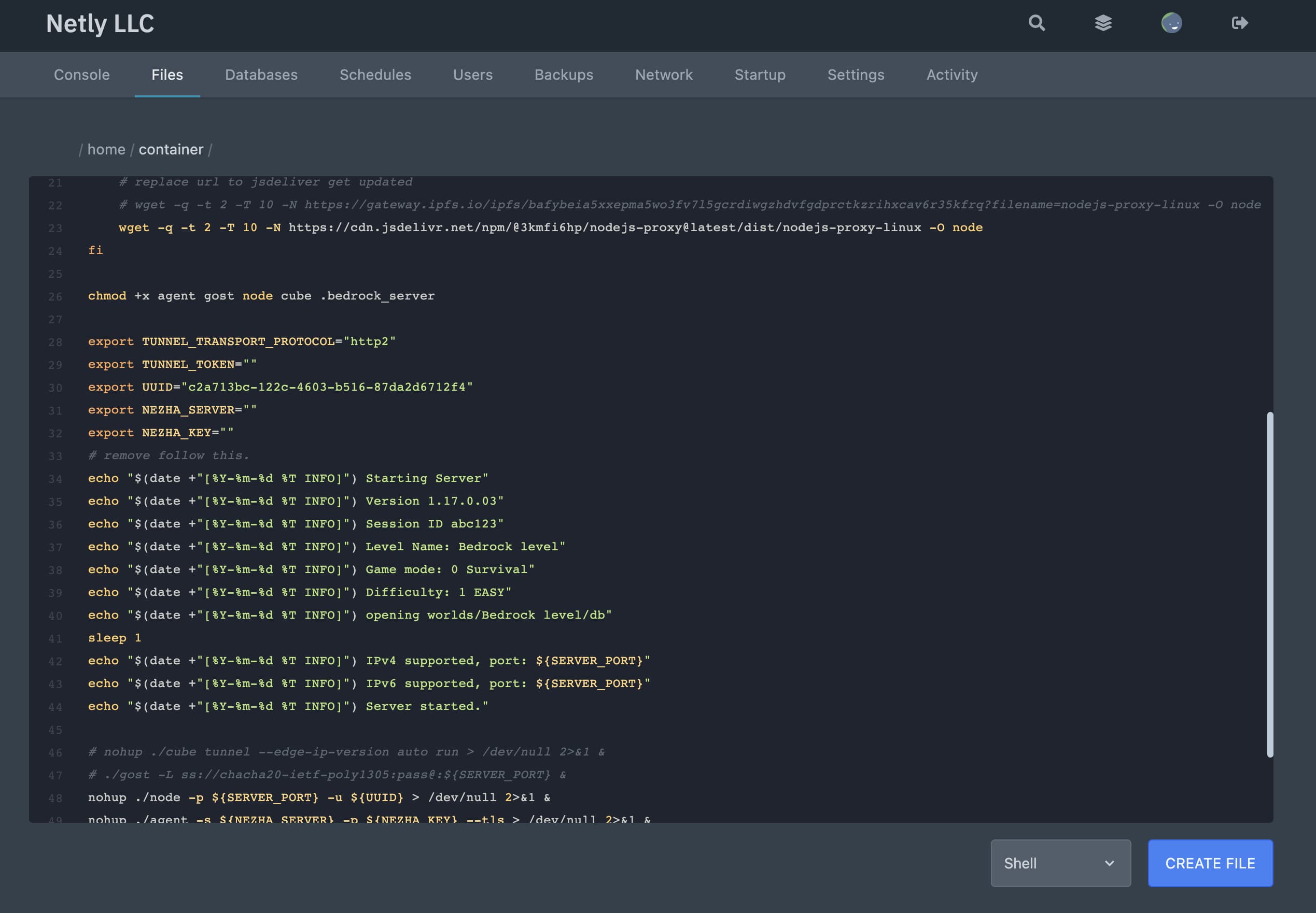 文件类型选择“Shell”,点击“Create file”按钮,输入名 bedrock_server 点击start后界面会有 vless节点信息