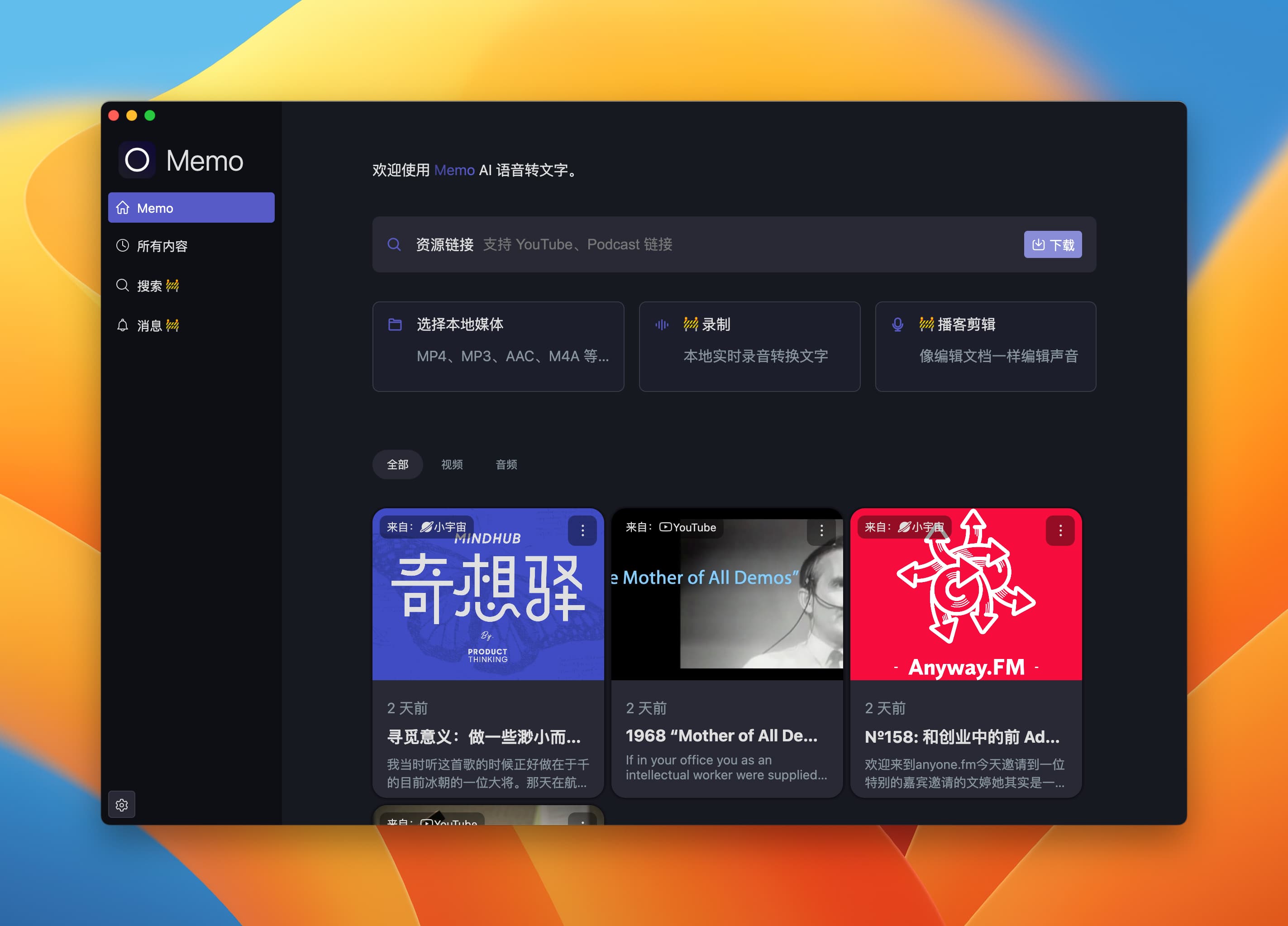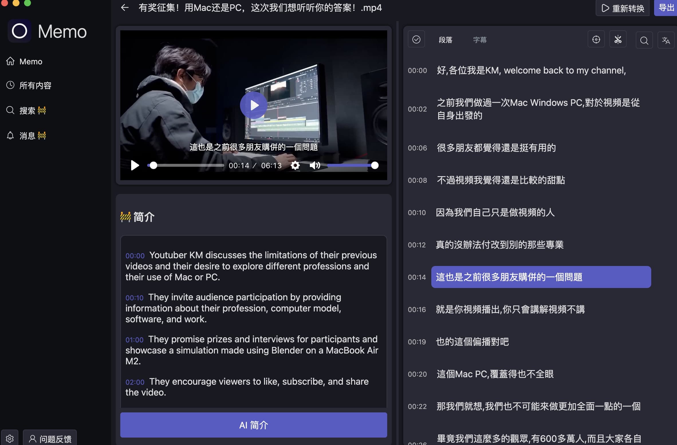 Memo-内置AI驱动的视频、播客转文字、字幕工具