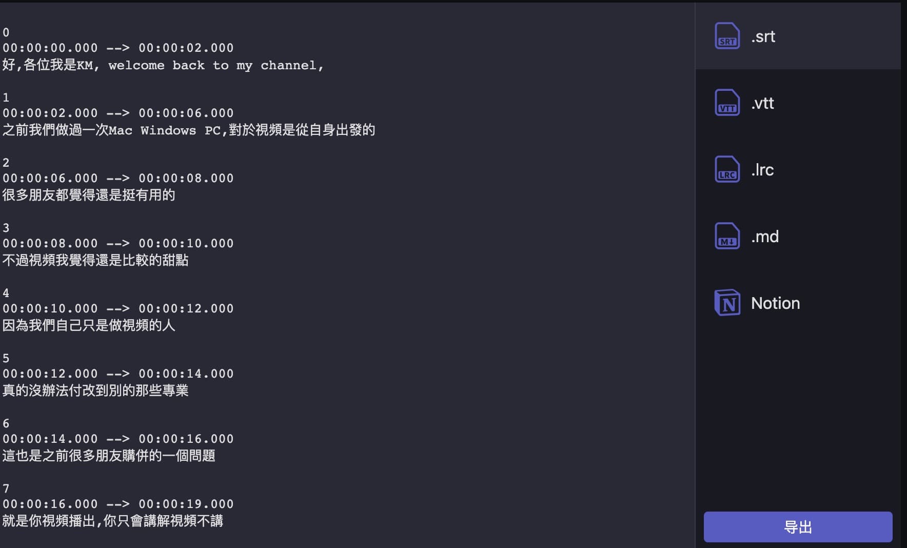 - 导出目前支持字幕、Markdown,接下来会支持 Notion 等常见笔记工具;