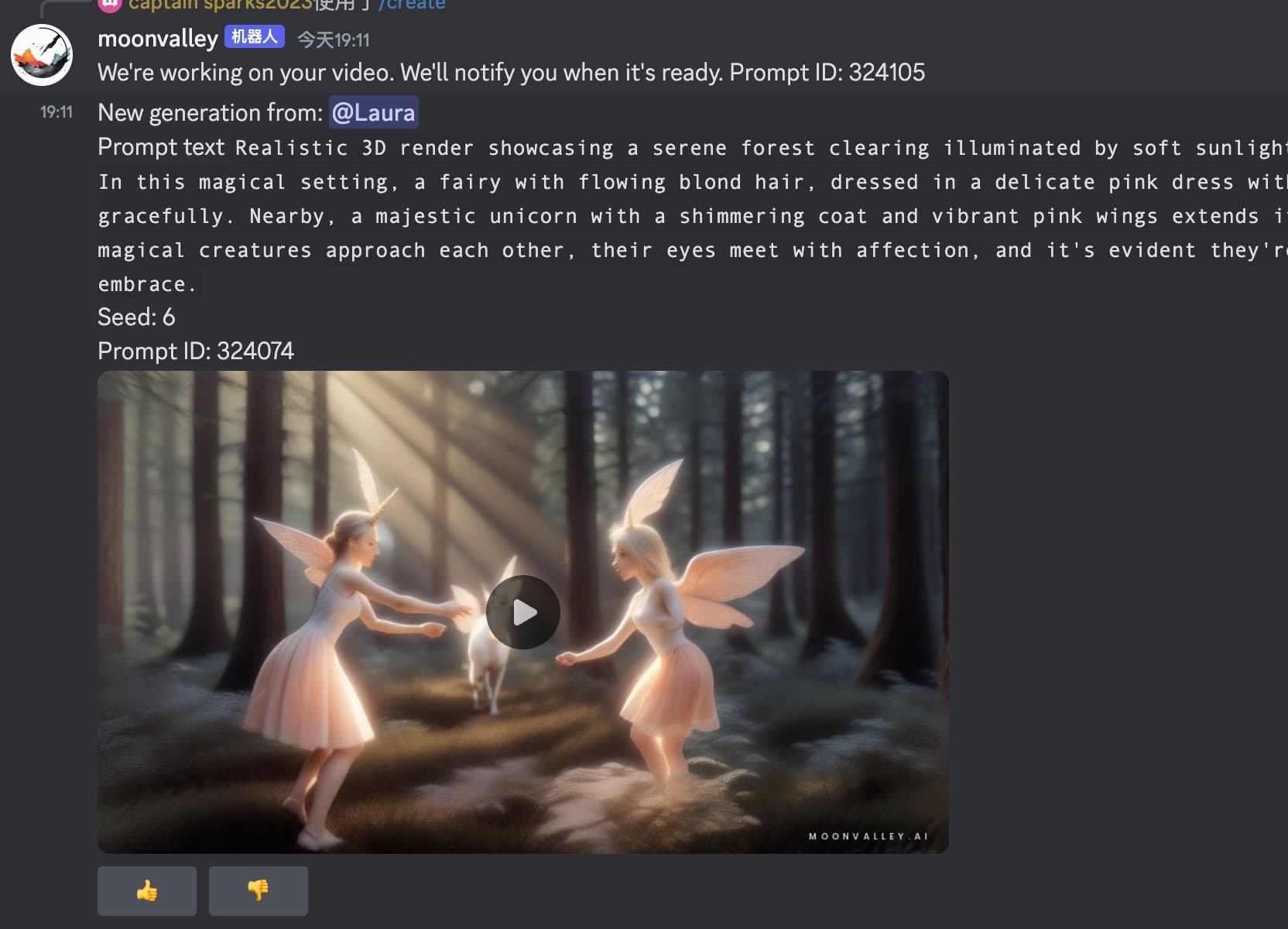 接着在服务器和机器人进行对话,例如输入:“Realistic 3D render showcasing a serene forest clearing illuminated by soft sunlight filtering through the treetops. In this magical setting, a fairy with flowing blond hair, dressed in a delicate pink dress with matching wings, hovers gracefully. Nearby, a majestic unicorn with a shimmering coat and vibrant pink wings extends itself in mid-flight. As the two magical creatures approach each other, their eyes meet with affection, and it’s evident they’re about to share a heartwarming embrace“