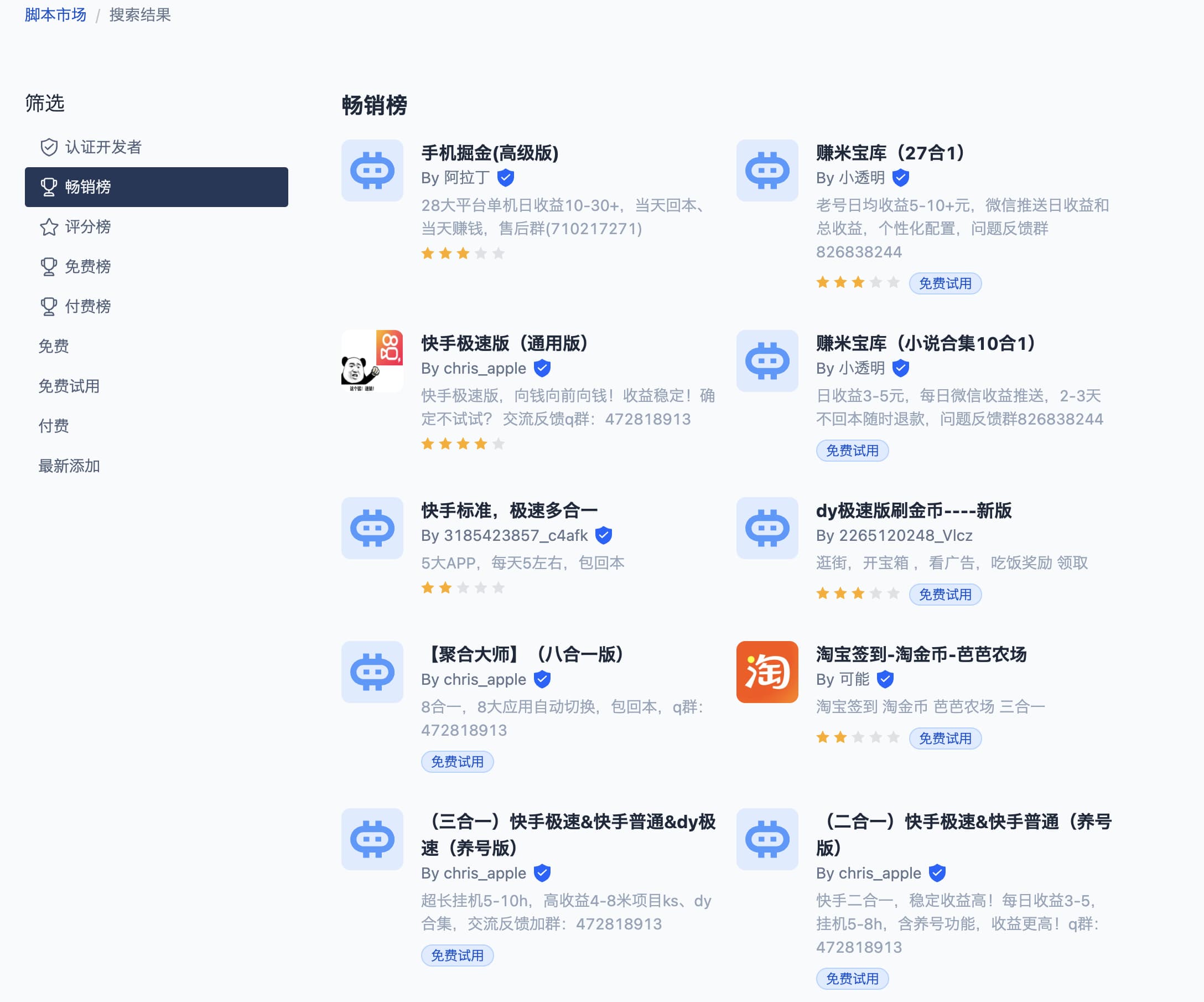 它可以定制化脚本,也拥有自己的赚钱模块市场,如果你是开发者或需求者也可以在它的市场进行定制化